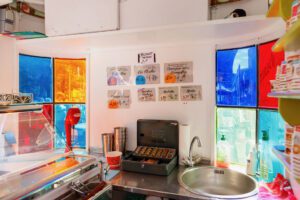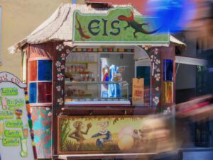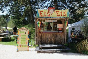 Liebevoll „der Kleine“ genannt ist das unser ältester Wagen – auf Wunsch mit Anbau (über der Anhängerkupplung). Bietet im Sommer Platz für 12 Eissorten.